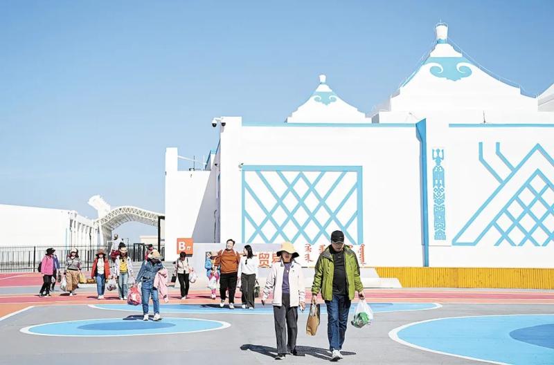 雄偉的策克口岸國門東側(cè),是一排排商業(yè)區(qū),商店、飯店、文化設(shè)施等一應(yīng)俱全,假日里游客眾多,熱鬧非凡;國門西側(cè),一座座形似蒙古包的白色建筑整齊排列,這就是中蒙邊民互市貿(mào)易區(qū)。策克口岸工作人員張銳介紹,自2014年起,經(jīng)過持續(xù)建設(shè)與完善,中蒙邊民互市貿(mào)易區(qū)逐步成形。依托這一平臺,口岸常態(tài)化舉辦特色商品展會,聚集了人氣,帶動了邊境旅游。