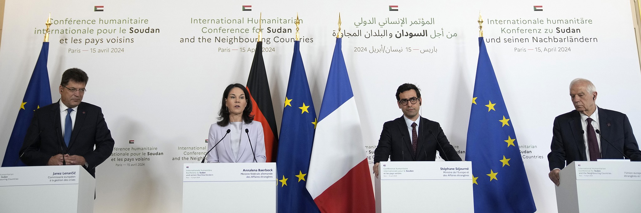 當(dāng)?shù)貢r(shí)間2024年4月15日,法國巴黎,法國外交部長(zhǎng)斯特凡納·塞茹爾內(nèi)(右二),德國外交部長(zhǎng)安娜萊娜·貝爾伯克,歐盟危機(jī)管理專員約翰·萊納西奇(左)和歐盟外交與安全事務(wù)高級(jí)代表何塞普·博雷利參加了蘇丹及其鄰國國際人道主義會(huì)議的聯(lián)合新聞發(fā)布會(huì)。