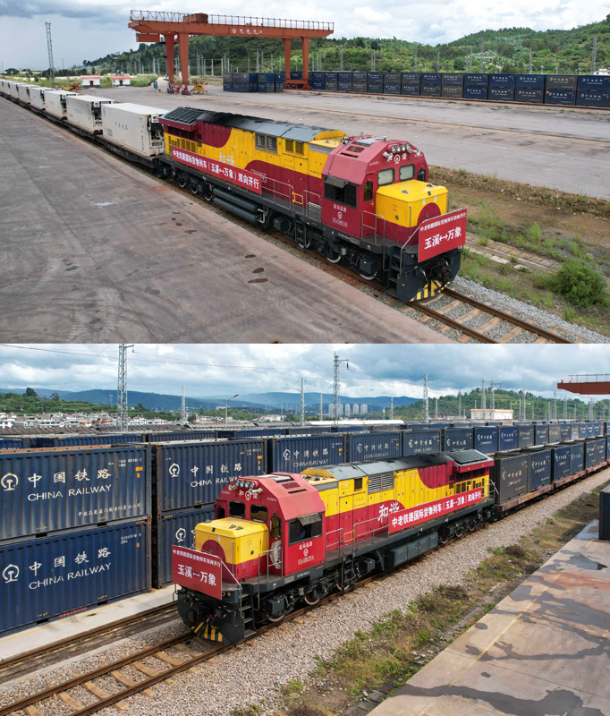 拼版照片:上圖是8月23日在中老鐵路玉溪研和站拍攝的準(zhǔn)備發(fā)車前往老撾萬(wàn)象的國(guó)際貨物列車(無(wú)人機(jī)照片);下圖是8月23日拍攝的從老撾萬(wàn)象發(fā)車并已抵達(dá)中老鐵路玉溪研和站的國(guó)際貨物列車(無(wú)人機(jī)照片)。