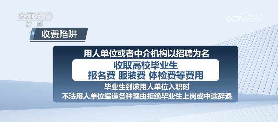 用人單位或者中介機(jī)構(gòu)以招聘為名,收取高校畢業(yè)生報(bào)名費(fèi)、服裝費(fèi)、體檢費(fèi)等費(fèi)用。畢業(yè)生到該用人單位入職時,不法用人單位編造各種理由拒絕畢業(yè)生上崗或中途辭退。