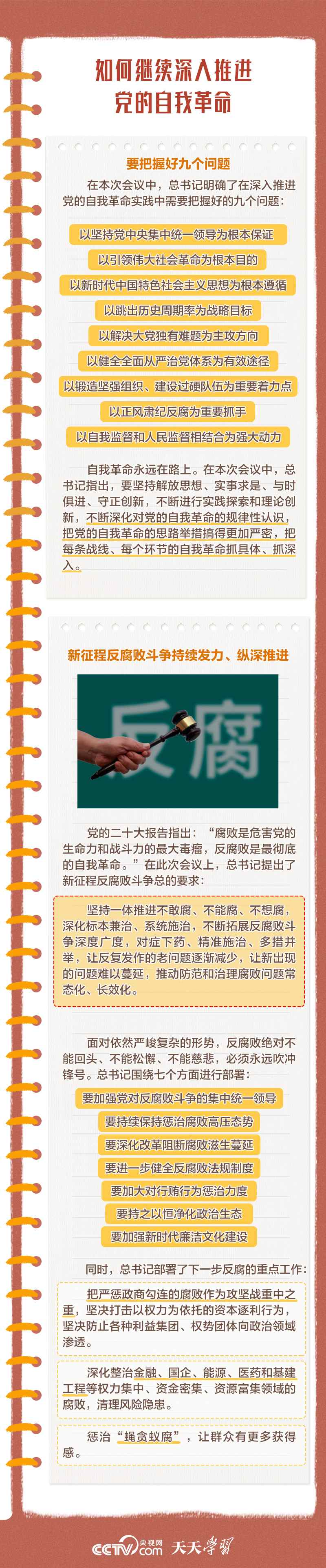 勇于自我革命是我們黨最鮮明的品格和最大的優(yōu)勢,總書記多次對推進(jìn)黨的自我革命作出重要部署。此次會議上,總書記深刻闡述了黨的自我革命的重要思想,明確提出需要把握好九個(gè)問題,并對持續(xù)發(fā)力、縱深推進(jìn)反腐敗斗爭作出戰(zhàn)略部署。央視網(wǎng)《天天學(xué)習(xí)》與您一起學(xué)習(xí)。