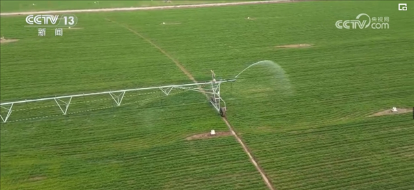 根據(jù)農(nóng)業(yè)專家的精準測算和調(diào)度,園區(qū)工作人員啟動了大型指針式噴灌機。