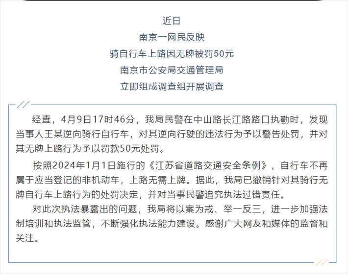 ·南京交警回應(yīng)市民騎自行車無牌被罰50元:撤銷處罰,追究民警責任。
