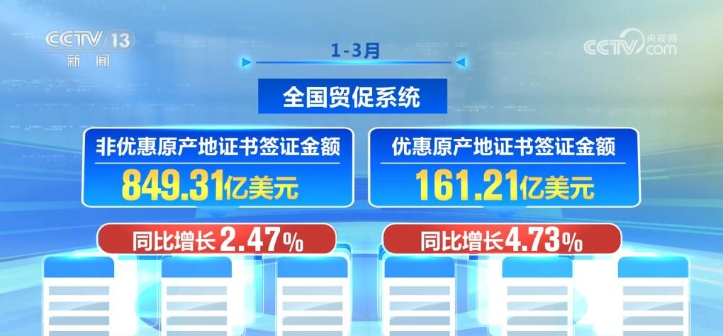 央視網(wǎng)消息:記者在4月28日中國貿(mào)促會(huì)發(fā)布會(huì)上獲悉,今年前三個(gè)月,全國貿(mào)促系統(tǒng)優(yōu)惠原產(chǎn)地證書簽證金額同比增長(zhǎng)4.73%。