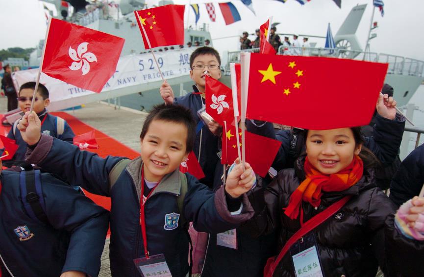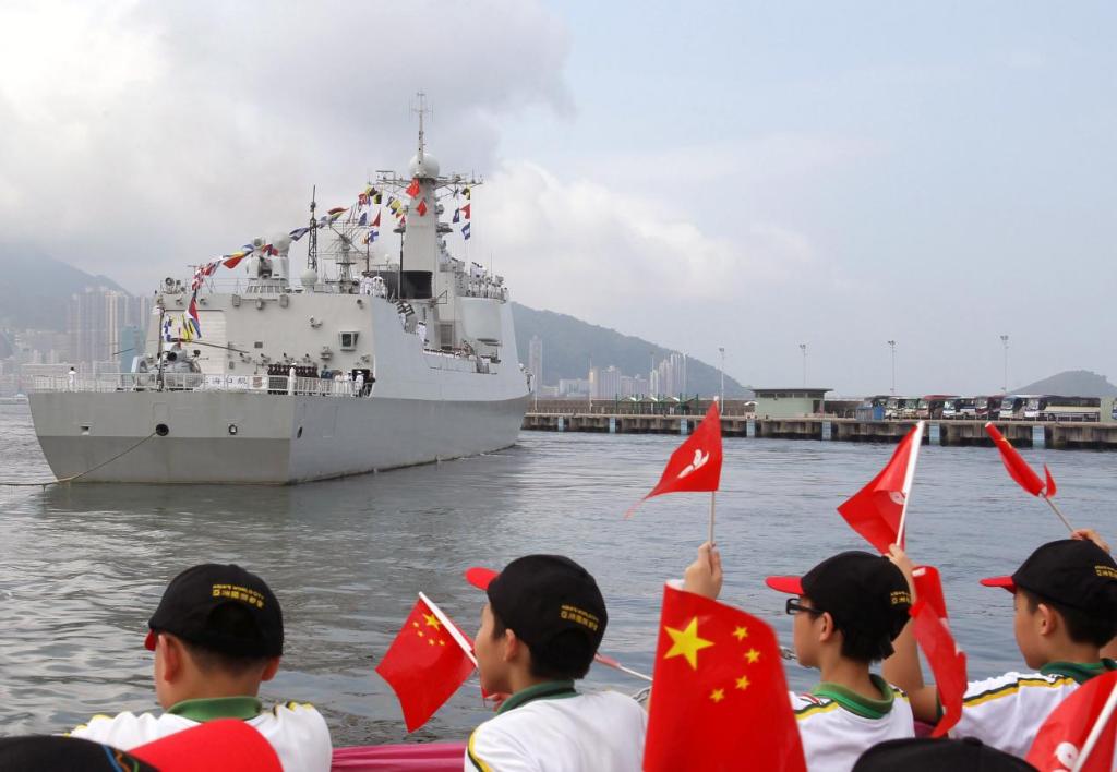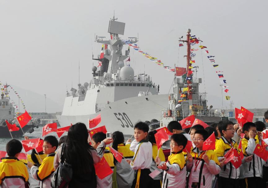 2009年12月17日,200名香港學(xué)生代表在昂船洲軍港碼頭揮舞著國旗和香港特區(qū)區(qū)旗為中國海軍529護航編隊送行。新華社記者郭剛攝
