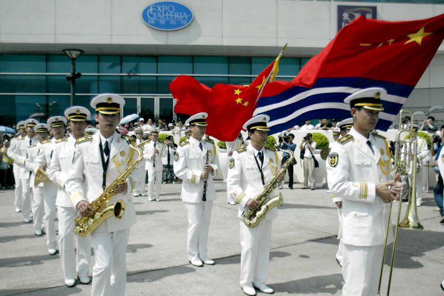 2004年5月1日,中國人民解放軍海軍軍樂團在香港金紫荊廣場為市民及游客演出。新華社記者李鵬攝