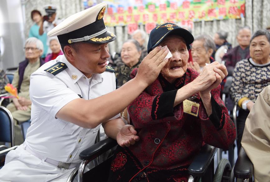 2017年7月10日,遼寧艦航母編隊的一名軍官為110歲的老人謝月瓊擦拭眼淚。當(dāng)日,遼寧艦航母編隊及解放軍駐香港部隊的60余名官兵一道前往香港亞洲婦女協(xié)進會何梁潔庭頤養(yǎng)之家護理院開展聯(lián)合慰問長者活動,向長者們贈送紀念品、捐贈慰問金及表演文藝節(jié)目。此次活動是遼寧艦編隊官兵在香港的一項慈善公益活動。新華社發(fā)(王申 攝)