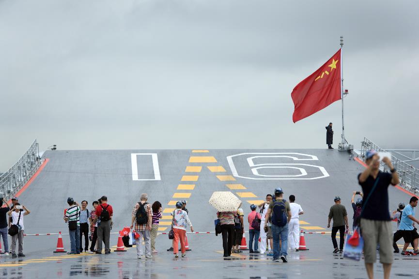2017年7月8日,香港市民在遼寧艦的飛行甲板上參觀。7月8日及9日,中國首艘航空母艦遼寧艦在香港向公眾開放。新華社記者秦晴攝