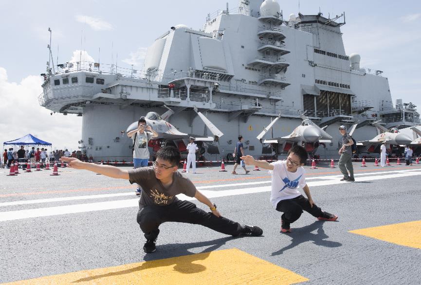 2017年7月9日,兩名青少年在遼寧艦的飛行甲板上模仿“航母STYLE”動作。7月8日及9日,中國首艘航空母艦遼寧艦在香港向公眾開放。新華社記者劉昀攝