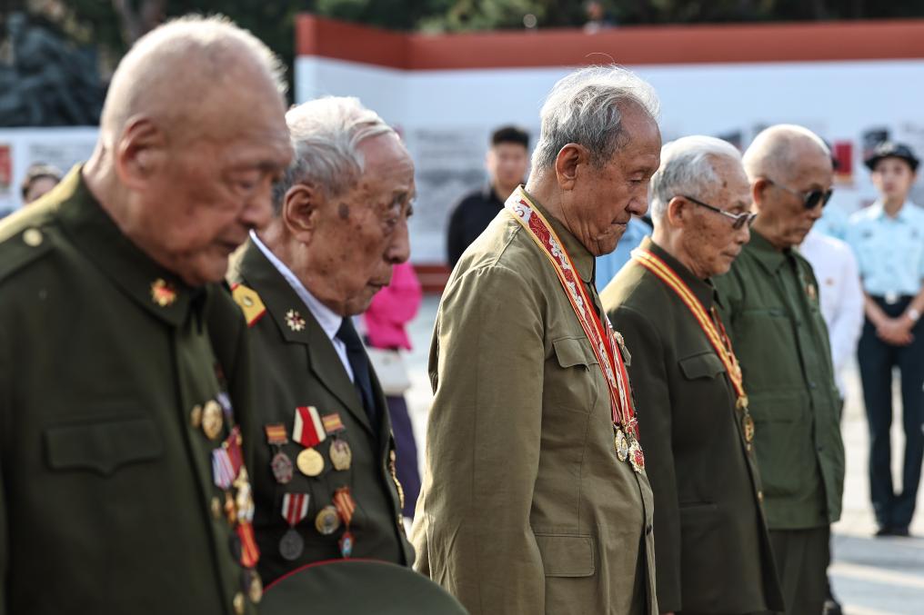 9月10日,抗美援朝老戰(zhàn)士在祭奠活動中默哀,左三為老戰(zhàn)士南啟祥。新華社記者潘昱龍 攝
