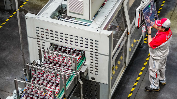中糧可口可樂(lè)飲料(貴州)有限公司的工作人員在生產(chǎn)線(xiàn)旁進(jìn)行操作(2025年8月24日攝)。新華社記者 陶亮 攝