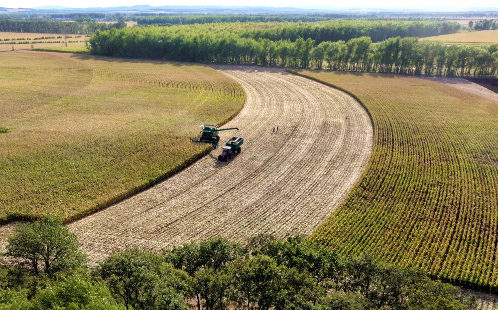 秋高云淡,黑龍江省七臺河市勃利縣的玉米地里一派繁忙景象。大型收割機(jī)往來穿梭,飽滿的玉米棒被自動(dòng)精準(zhǔn)收入機(jī)身。脫粒后,金燦燦的玉米粒源源不斷涌入隨行的運(yùn)糧車。
