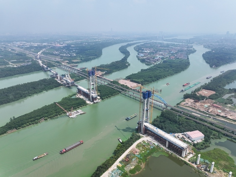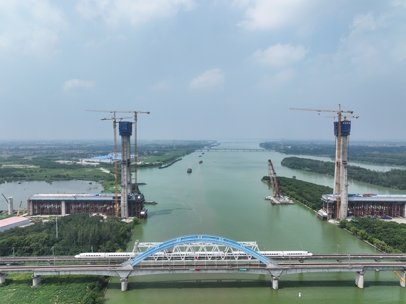 這是8月5日拍攝的滬渝蓉高鐵跨京杭運河斜拉橋建設現場(無人機照片)。