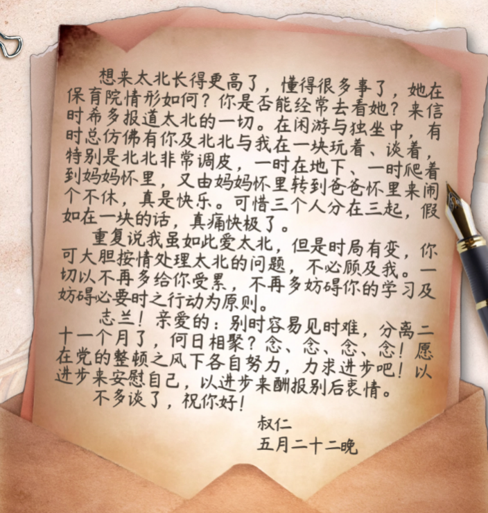 在信的最后,左權(quán)不得不忍痛交代妻子:“我雖如此愛(ài)太北,但是時(shí)局有變,你可大膽按情處理太北的問(wèn)題,不必顧及我。”并勉勵(lì)妻子以進(jìn)步來(lái)安慰自己,以進(jìn)步來(lái)酬報(bào)別后衷情。