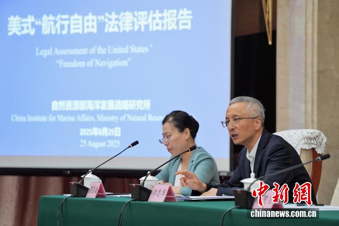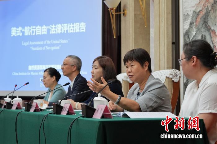 8月25日,中國自然資源部海洋發(fā)展戰(zhàn)略研究所在北京發(fā)布《美式“航行自由”法律評估報告》中英文版。該《報告》旨在對美國“航行自由”相關主張和實踐是否符合國際條約和一般國際法、是否具備法律基礎進行評估。圖為自然資源部海洋發(fā)展戰(zhàn)略研究所前所長張海文(右二)答記者問。中新社記者 張祥毅 攝