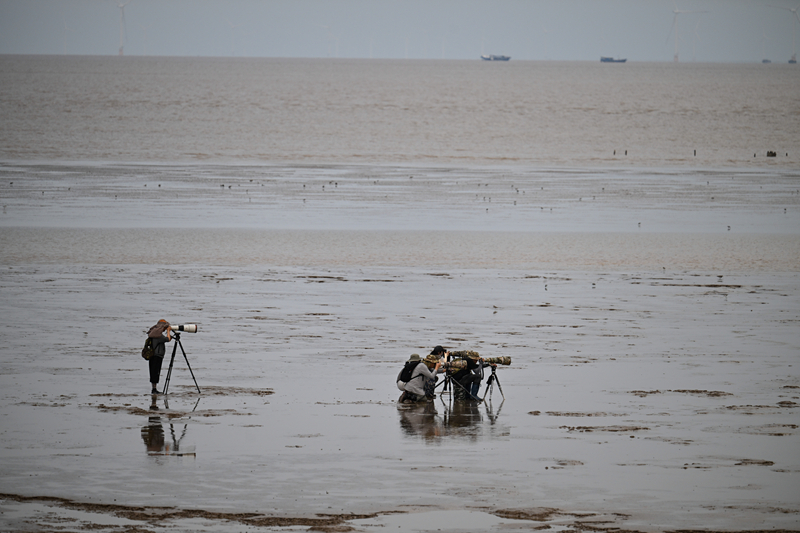 8月25日,攝影愛好者在東臺條子泥濕地拍鳥。