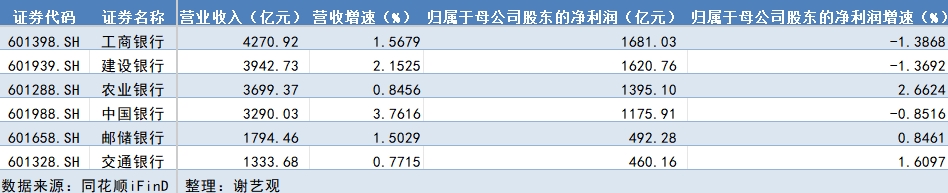 具體來看,農(nóng)業(yè)銀行、交通銀行、郵儲銀行實現(xiàn)營收和凈利潤指標雙增,但工商銀行、建設銀行、中國銀行歸屬于母公司股東的凈利潤同比有所下降,降幅分別為1.39%、1.37%和0.85%。