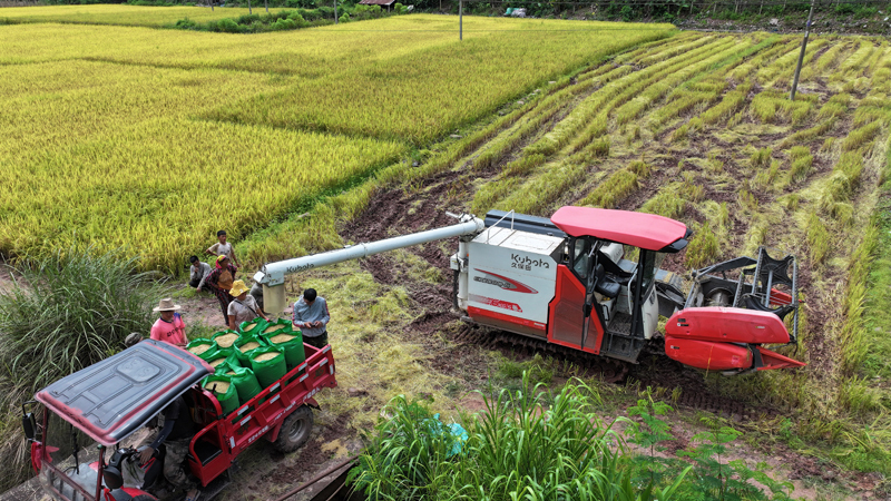 8月30日,云南省勐臘縣勐侖鎮(zhèn)大卡村農(nóng)民運(yùn)送剛收獲的水稻(無人機(jī)照片)。