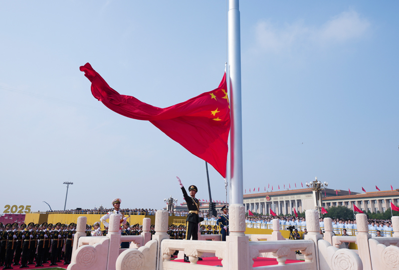 9月3日,紀(jì)念中國人民抗日戰(zhàn)爭暨世界反法西斯戰(zhàn)爭勝利80周年大會在北京隆重舉行。這是天安門廣場舉行隆重的升國旗儀式。