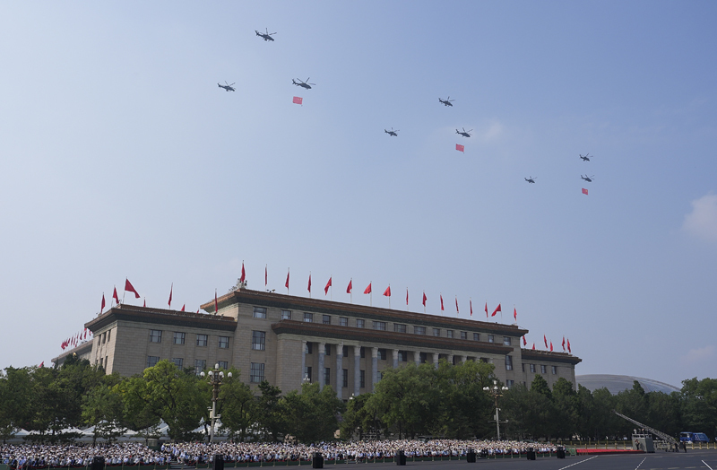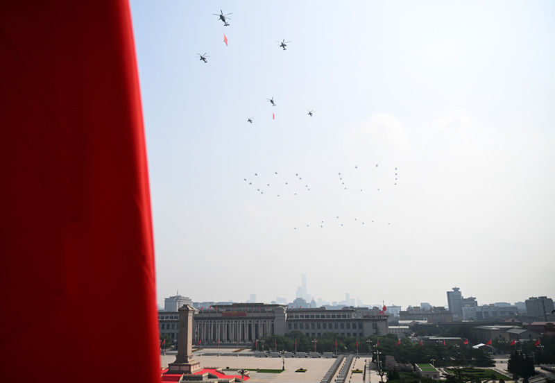 9月3日,紀(jì)念中國人民抗日戰(zhàn)爭暨世界反法西斯戰(zhàn)爭勝利80周年大會(huì)在北京隆重舉行。這是空中護(hù)旗梯隊(duì)飛過天安門廣場上空,26架直升機(jī)匯成巨大的“80”字樣。