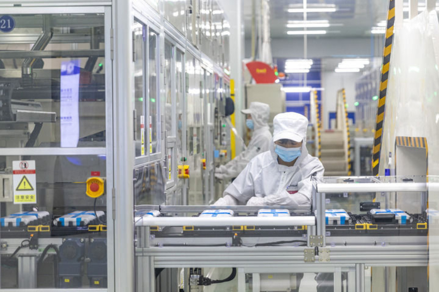 2024年9月27日,在位于重慶市銅梁區(qū)的海辰儲能重慶制造基地,工作人員在生產線上初步檢測兩個電芯是否配對。新華社記者 黃偉 攝