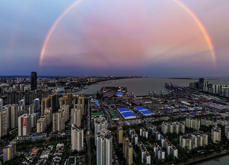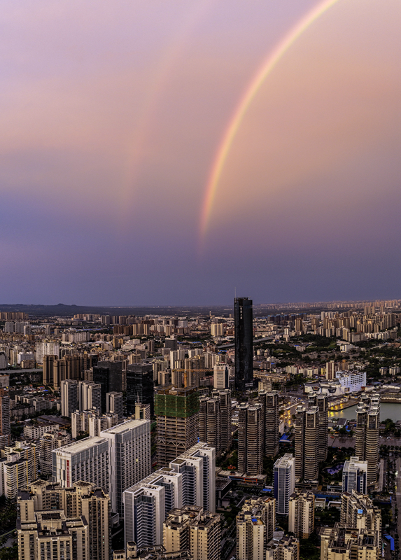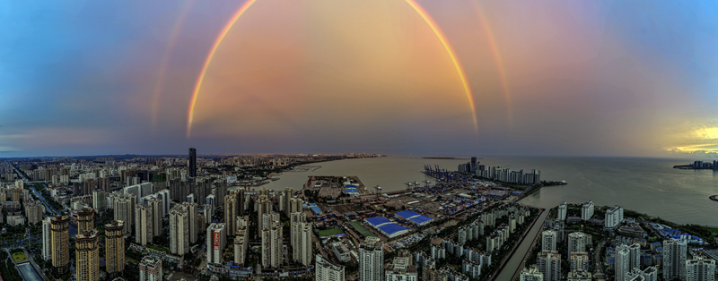 10月6日清晨,??谑猩峡粘霈F(xiàn)彩虹。今年第21號(hào)臺(tái)風(fēng)“麥德姆”對(duì)??诘挠绊戁呌诮Y(jié)束,??诔菂^(qū)逐步恢復(fù)正常秩序。