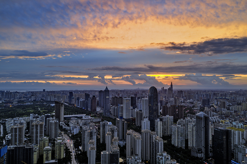 10月6日清晨拍攝的朝霞映照下的??诔菂^(qū)。