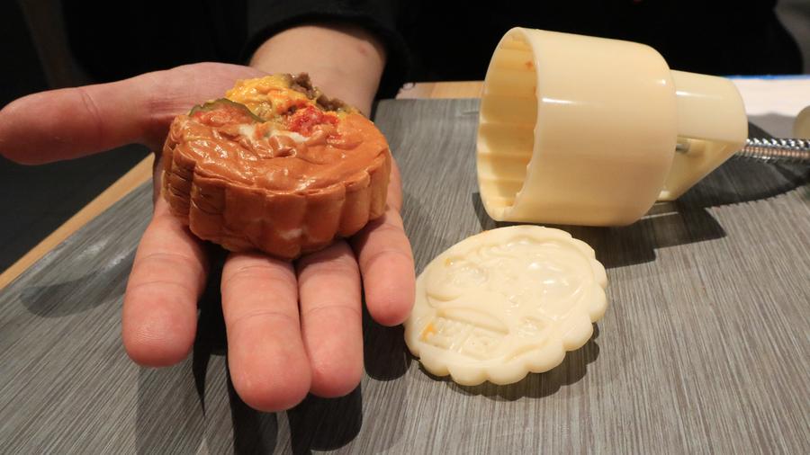 年輕人壓制成的“漢堡月餅”。 新華社記者 樊欣陽 攝