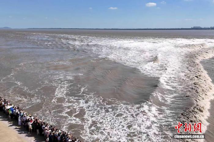 中新網(wǎng)嘉興10月9日電(胡豐盛 孫楊洋)10月9日,農(nóng)歷八月十八,被譽(yù)為“天下第一潮”的錢(qián)塘江大潮如期而至,數(shù)萬(wàn)中外游客齊聚浙江海寧鹽官觀潮點(diǎn),共賞這一自然奇觀。
