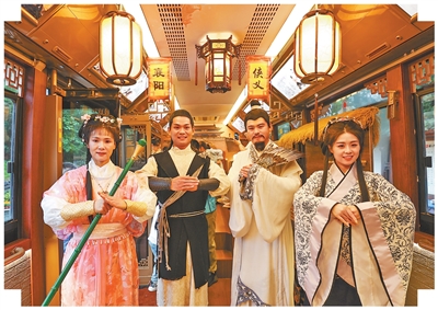 10月5日,湖北襄陽,“黃蓉”“郭靖”“諸葛亮”“黃月英”(從左向右)在“俠義襄陽”旅游公交上與游客互動。楊東 攝(人民視覺)