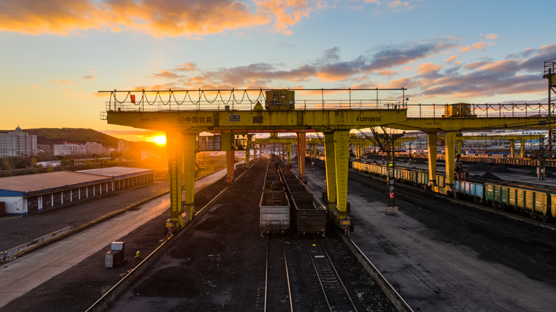 10月18日,在中國(guó)鐵路哈爾濱局集團(tuán)有限公司綏芬河站,機(jī)械化換裝場(chǎng)在對(duì)入境貨物進(jìn)行換裝作業(yè)(無(wú)人機(jī)照片)。