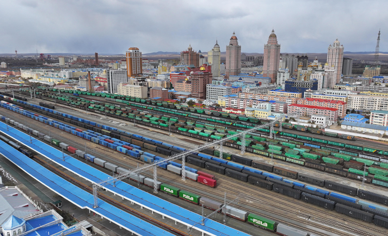 10月18日,在中國(guó)鐵路哈爾濱局集團(tuán)有限公司滿洲里站編組場(chǎng),中歐班列及進(jìn)口貨物列車在等待取送車作業(yè)(無(wú)人機(jī)照片)。