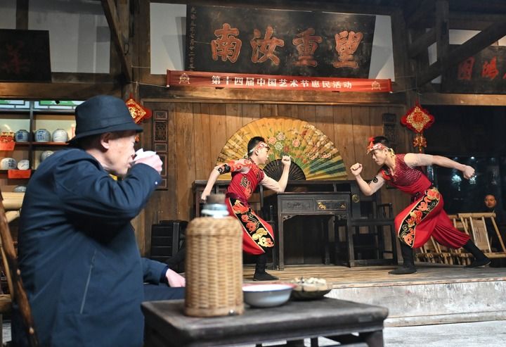 2025年10月25日,茶客在成都金琴老茶館一邊喝茶一邊觀看沈陽雜技演藝集團雜技演員表演的雜技節(jié)目《男子對手》,這是第十四屆中國藝術節(jié)惠民活動之一。新華社記者 劉坤 攝