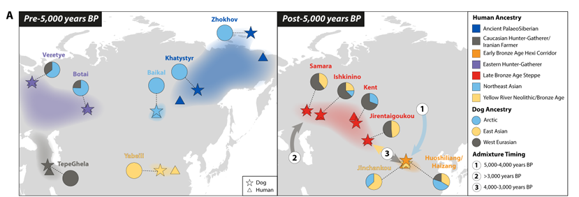 科研團(tuán)隊這項研究首先發(fā)現(xiàn)中國五千年前存在獨(dú)特的家犬古老血統(tǒng),隨后數(shù)千年中國古代家犬逐漸出現(xiàn)來自西伯利亞和西方的古代家犬血統(tǒng)滲入,同時來自中國的古老東亞祖份也廣泛擴(kuò)散到了歐亞草原多處。團(tuán)隊通過與人類古基因組數(shù)據(jù)和證據(jù)對照,發(fā)現(xiàn)家犬?dāng)?shù)次滲入事件與人類的多次遷徙高度重合。如東西伯利亞早全新世家犬譜系與同時期人類譜系的分布高度吻合。此外,歐亞草原地區(qū)家犬中西方祖分的增加也與古人類遷移歷史相吻合,具體而言我們發(fā)現(xiàn)歐亞草原前期的新石器時代家犬和東歐狩獵采集人群相關(guān),后期的青銅時代家犬和伊朗農(nóng)耕人群和高加索狩獵采集者相關(guān)。