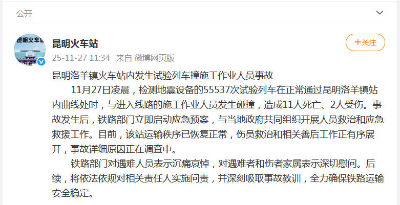 據昆明鐵路局昆明站官方微博消息,11月27日凌晨,檢測地震設備的55537次試驗列車在正常通過昆明洛羊鎮(zhèn)站內曲線處時,與進入線路的施工作業(yè)人員發(fā)生碰撞,造成11人死亡、2人受傷。事故發(fā)生后,鐵路部門立即啟動應急預案,與當地政府共同組織開展人員救治和應急救援工作。目前,該站運輸秩序已恢復正常,傷員救治和相關善后工作正有序展開,事故詳細原因正在調查中。