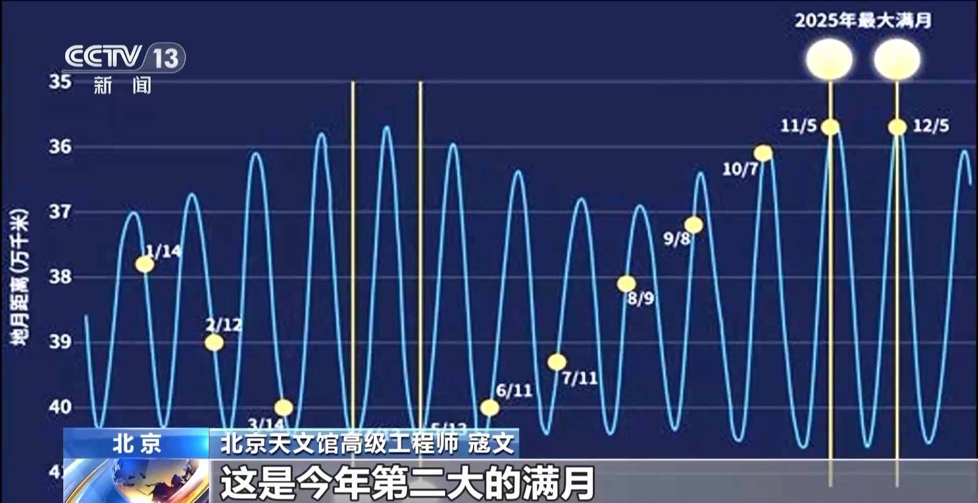 北京天文館高級(jí)工程師 寇文:12月5日大約早晨7點(diǎn)14分是滿月,而月亮過近地點(diǎn)的時(shí)間是在這之前大約12個(gè)小時(shí),這是今年第二大的滿月,也可以算是一次“超級(jí)月亮”。