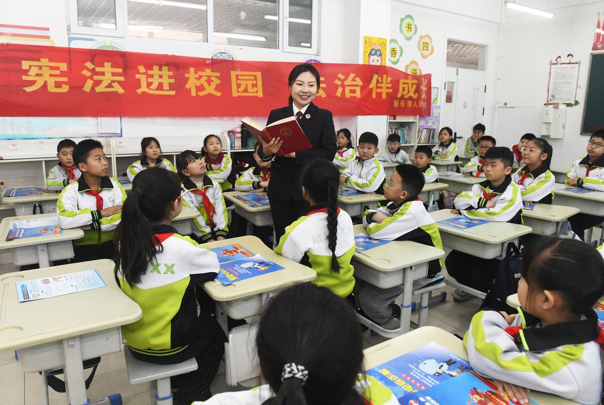12月3日,在河北省石家莊新樂市民生街小學,新樂市人民檢察院工作人員給學生講解憲法知識。(工人日報通訊員 賈敏杰 攝)