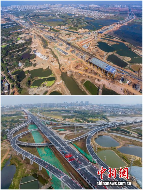 2025年12月18日,海南自由貿(mào)易港正式啟動(dòng)全島封關(guān)。近年來(lái),海南自貿(mào)港建設(shè)在利好政策帶動(dòng)下不斷刷新“自貿(mào)港速度”,一個(gè)個(gè)重大項(xiàng)目、重點(diǎn)園區(qū)拔地而起,直觀呈現(xiàn)海南自貿(mào)港的蓬勃生機(jī)。這里正成為中國(guó)對(duì)外開(kāi)放的新前沿、互利合作的新熱土和推動(dòng)經(jīng)濟(jì)全球化的新引擎。上資料圖為2021年2月6日正在建設(shè)中的G15沈海高速公路??诙雾?xiàng)目海秀互通,下資料圖為2022年12月28日G15沈海高速公路??诙谓ǔ赏ㄜ?。(拼版圖,無(wú)人機(jī)照片)