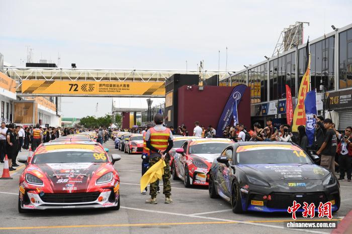 2025年11月13日,第72屆澳門(mén)格蘭披治大賽車(chē)開(kāi)賽,澳門(mén)傳奇的“東望洋賽道”再度響起賽車(chē)引擎的轟鳴聲。圖為參加練習(xí)賽的賽車(chē)準(zhǔn)備出發(fā)?!≈行律缬浾?鄭嘉偉 攝