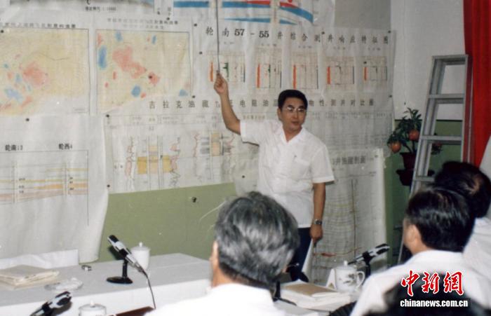 1991年6月,梁狄剛在整體解剖輪南勘探會(huì)上作報(bào)告。(資料圖)中國石油塔里木油田分公司供圖