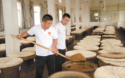 一旁,28歲的學(xué)徒李君正把缸里的醋醅翻到另一個(gè)醋缸之中。這是為了降溫而進(jìn)行的“打平翻缸”操作,要持續(xù)15天時(shí)間?!八螏煾嫡f(shuō),發(fā)酵環(huán)節(jié)最難掌握的就是溫度的控制和時(shí)機(jī)。”以前種地為生的李君,已經(jīng)跟著宋俊鵬學(xué)了5年釀醋,一個(gè)月有將近4000元的收入,“學(xué)會(huì)獨(dú)門技藝,咱也是手藝人了!”