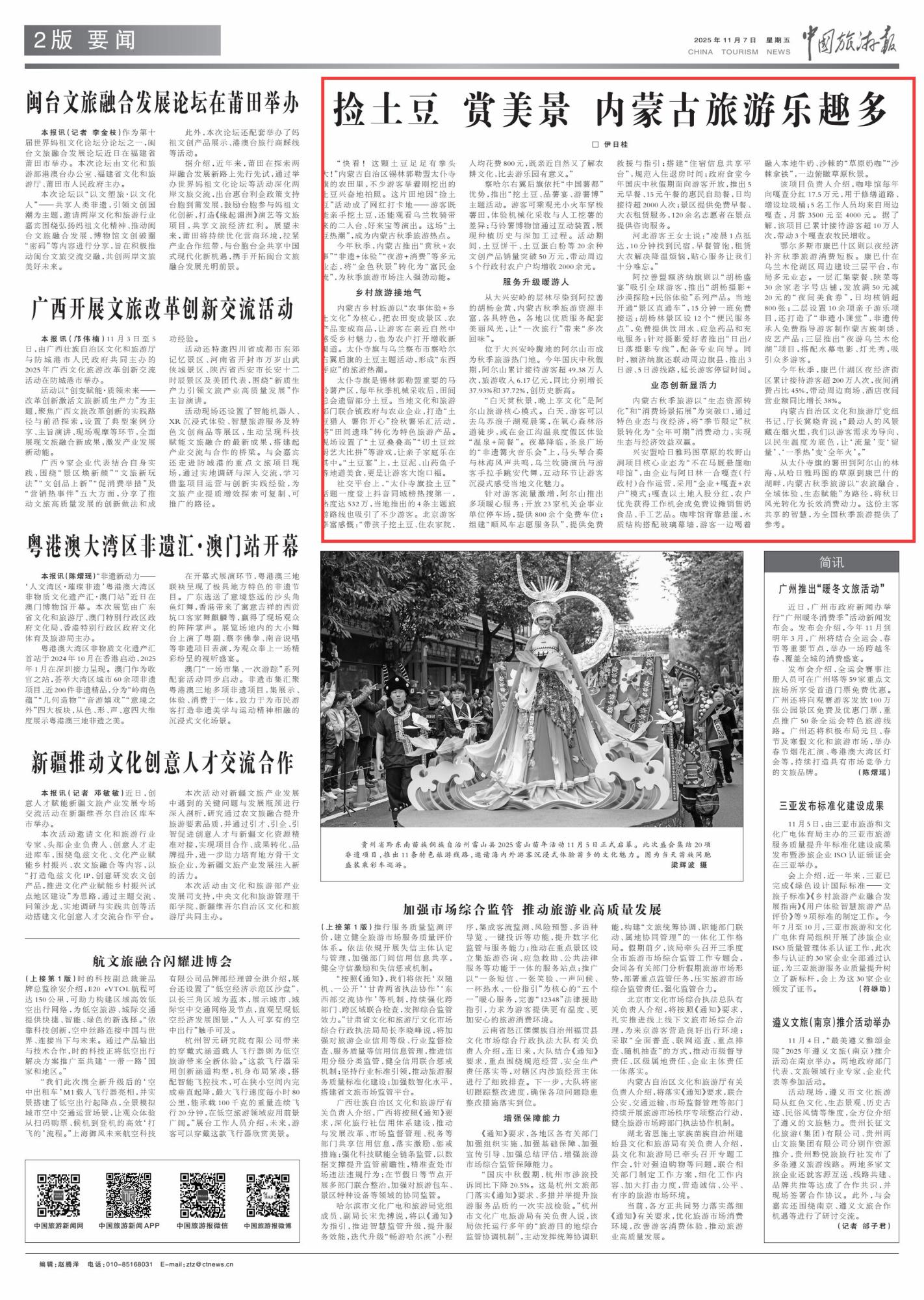 2025年11月7日《中國旅游報》第2版刊發(fā)了《撿土豆 賞美景 內(nèi)蒙古旅游樂趣多》的文章,報道了今年秋季,內(nèi)蒙古推出“賞秋+農(nóng)事”“非遺+體驗(yàn)”“夜游+消費(fèi)”等多元業(yè)態(tài),將“金色秋景”轉(zhuǎn)化為“富民金流”,為秋季旅游市場注入強(qiáng)勁動能。