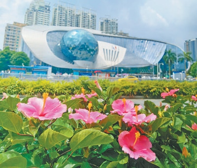 南寧市區(qū)最醒目的“朱槿花”,是位于城區(qū)核心的中國—東盟博覽會永久會址。會址主建筑頂端是一朵高49米的巨大“朱槿花”。這朵“朱槿花”是南寧市最具辨識度的地標,也是南寧開放發(fā)展的一道亮麗風景。