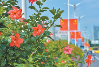 廣西南寧街頭的朱槿花。本報記者 鄧建勝攝