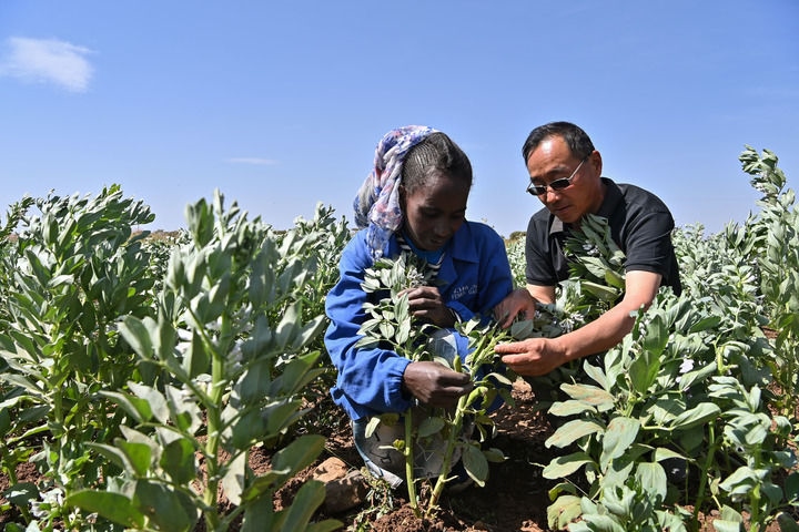 2023年9月27日,在位于厄立特里亞阿斯馬拉的農業(yè)技術援助項目示范地,中國援厄第三期高級農業(yè)專家組豆類作物專家劉運民(右)指導當?shù)剞r戶進行蠶豆作物的田間管理。新華社記者 韓旭 攝