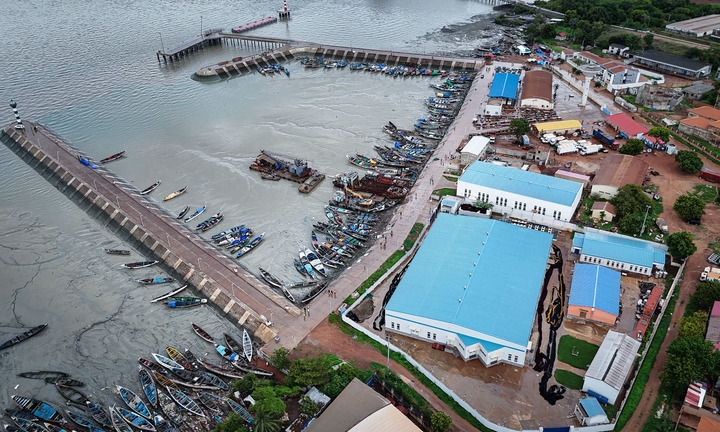 這是2024年7月8日在幾內亞比紹首都比紹拍攝的板丁漁業(yè)碼頭和中企投建的水產品加工存儲綜合設施(右側藍頂建筑區(qū)域)(無人機照片)。新華社記者 韓旭 攝
