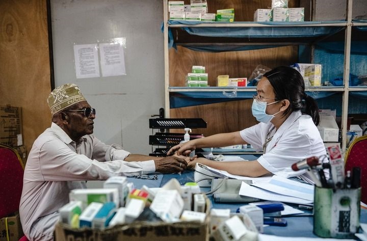 2024年1月11日,中國第15批援科摩羅醫(yī)療隊隊長潘春熹在位于科摩羅首都莫羅尼的馬魯夫醫(yī)院內為患者看病。新華社記者 王冠森 攝
