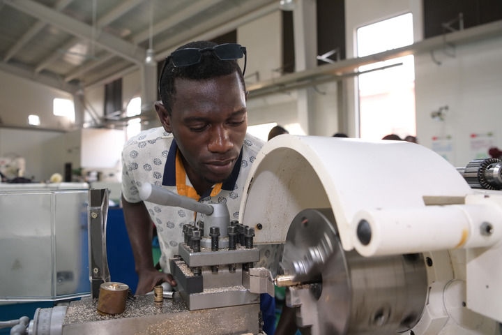 2023年1月10日,在加蓬首都利伯維爾的恩考克經濟特區(qū),恩考克國際職業(yè)教育和培訓中心(由中國航空技術國際控股有限公司聯(lián)合成都航空職業(yè)技術學院等院校共建)的學生進行車削加工操作訓練。新華社記者 韓旭 攝