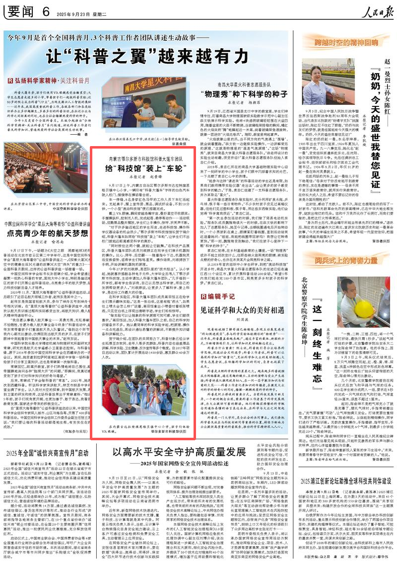 2025年9月23日,《人民日報》第6版刊發(fā)題為《內(nèi)蒙古鄂爾多斯市科技館科普大篷車團(tuán)隊給“科技館”裝上“車輪”》的文章,報道了內(nèi)蒙古自治區(qū)鄂爾多斯市,科普大篷車如同給“科技館”裝上“車輪”,讓學(xué)生們不出校門就能近距離感受科學(xué)的奧妙。