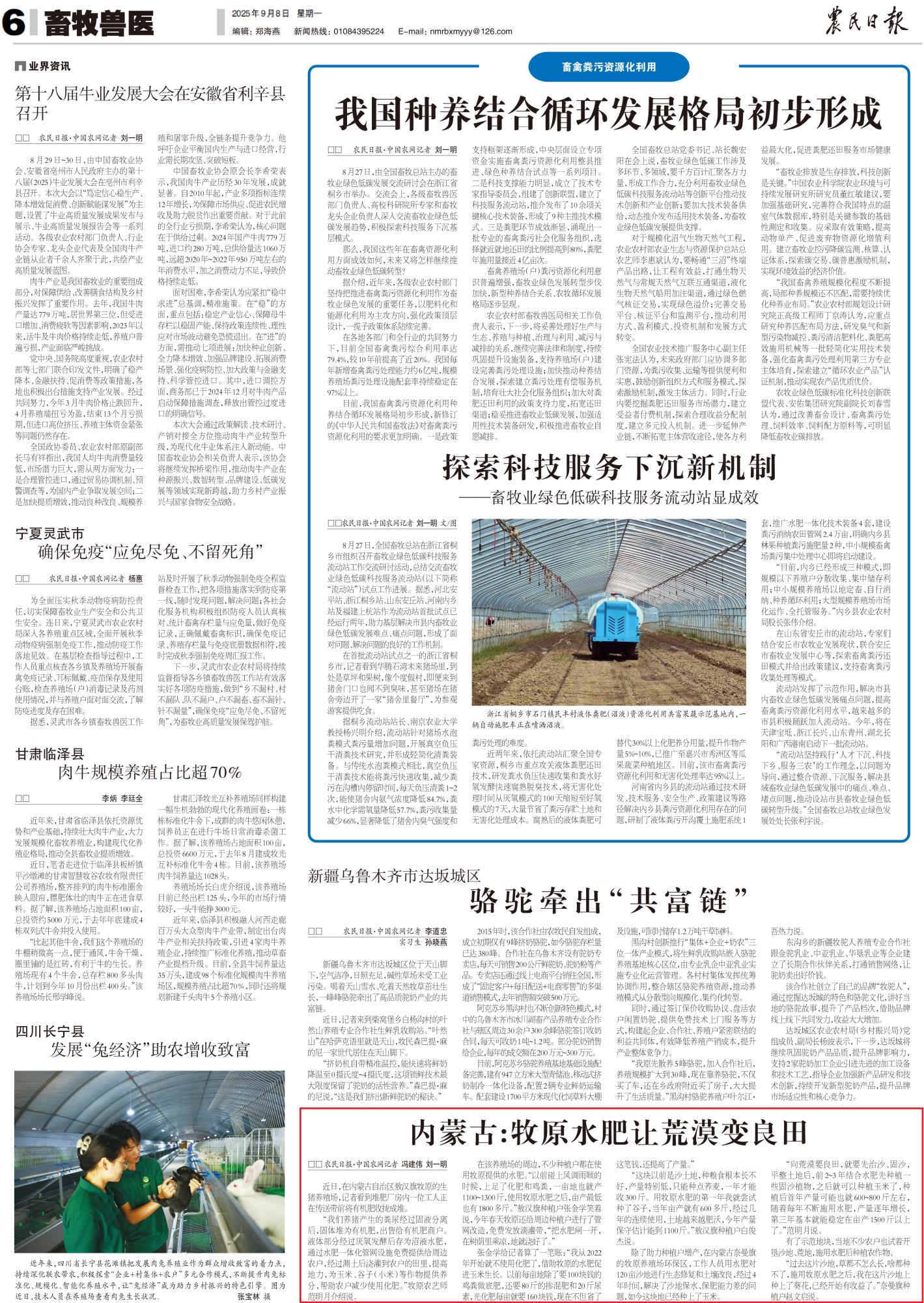 2025年9月8日,《農民日報》第6版整版刊發(fā)題為《內蒙古:牧原水肥讓荒漠變良田》的文章,報道了在內蒙古奈曼旗的牧原養(yǎng)殖場環(huán)保區(qū),工作人員用水肥對120畝沙地進行生態(tài)修復和土壤改良,經過4年時間,解決了沙地保水、保肥能力差的問題,如今這塊地已經種上了玉米。